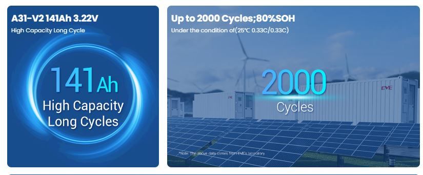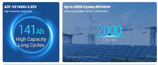 Ưu điểm của A31-V2 là sự ổn định về điện áp, khả năng duy trì hiệu suất tốt sau nhiều chu kỳ và độ an toàn cao nhờ hoá học LFP. Cấu trúc prismatic giúp cell dễ đồng bộ trong module, giảm sai lệch giữa các cell khi vận hành. Chu kỳ sử dụng dài giúp tối ưu chi phí đầu tư và bảo trì.