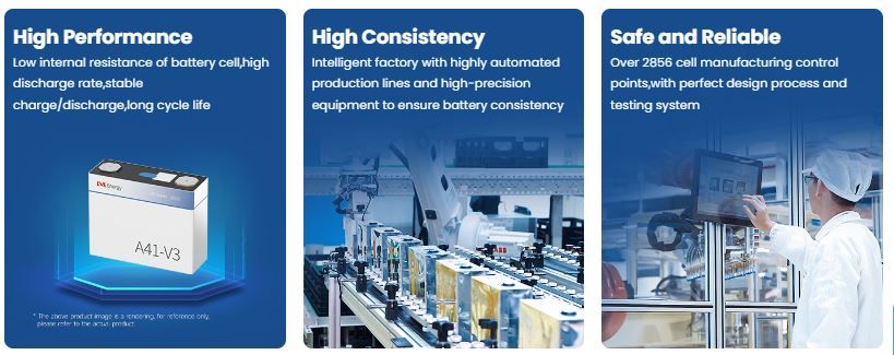 Ưu điểm lớn nhất của A41V3.1 chính là độ bền chu kỳ và khả năng chịu nhiệt vượt trội của công nghệ LFP. Cell giữ được hiệu suất ổn định trong suốt quá trình sạc – xả, giúp doanh nghiệp giảm thiểu chi phí bảo trì trong dài hạn. Bên cạnh đó, cấu trúc prismatic giúp cell dễ ghép module, đảm bảo tính đồng nhất và an toàn trong vận hành.