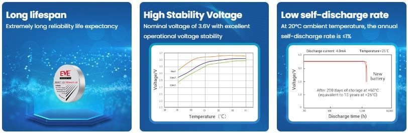 Điện áp 3.6V ổn định, phù hợp thiết bị xả thấp và truyền tín hiệu định kỳ.
