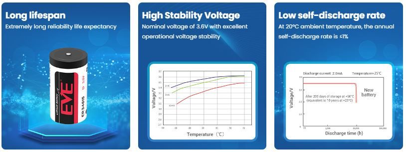 Ưu điểm của ER34615 nằm ở dung lượng rất lớn (lên đến 19Ah tùy phiên bản) và tỷ lệ tự xả thấp dưới 1% mỗi năm, giúp thiết bị hoạt động ổn định trong suốt vòng đời dài. Pin vận hành tốt trong phạm vi nhiệt độ rộng, phù hợp môi trường khắc nghiệt và điều kiện lắp đặt ngoài trời.