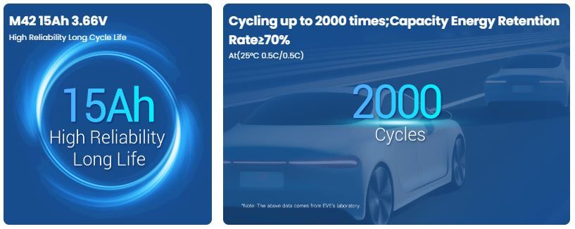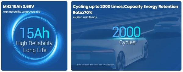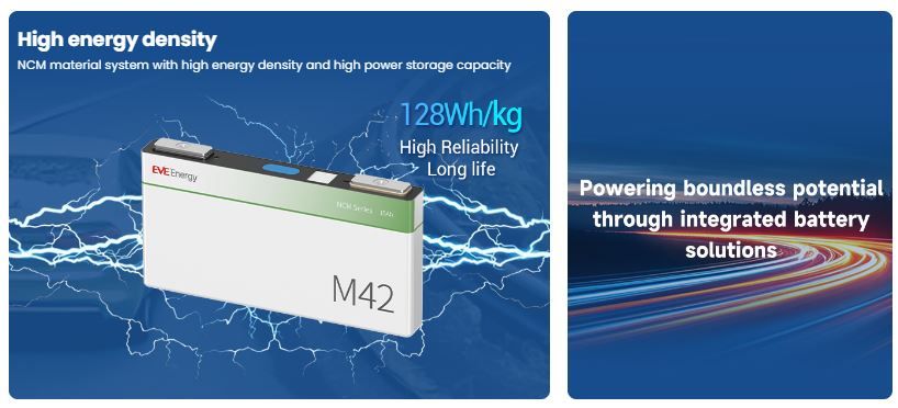 Ưu điểm nổi bật của M42 là mật độ năng lượng cao, giúp thiết bị kéo dài thời gian hoạt động mà không làm tăng kích thước đáng kể. Hiệu suất xả mạnh hỗ trợ các ứng dụng cần phản hồi nhanh và dòng lớn, đặc biệt trong e-mobility và thiết bị công nghiệp nhẹ. Thiết kế prismatic đảm bảo độ đồng đều trong module, góp phần nâng cao độ bền của hệ pin.
