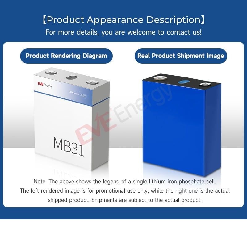 MB31 là cell lithium iron phosphate dạng khối được EVE sản xuất theo tiêu chuẩn quốc tế, tập trung vào sự bền bỉ và tính an toàn trong vận hành. Thiết kế prismatic với vỏ nhôm cứng mang lại khả năng chống rung, chống sốc và chịu nhiệt tốt hơn, đặc biệt thích hợp cho các module pin công suất lớn. EVE ứng dụng dây chuyền tự động hóa trong sản xuất nên MB31 đạt độ đồng đều cao, đảm bảo sự ổn định trong dòng xả và dung lượng thực tế.